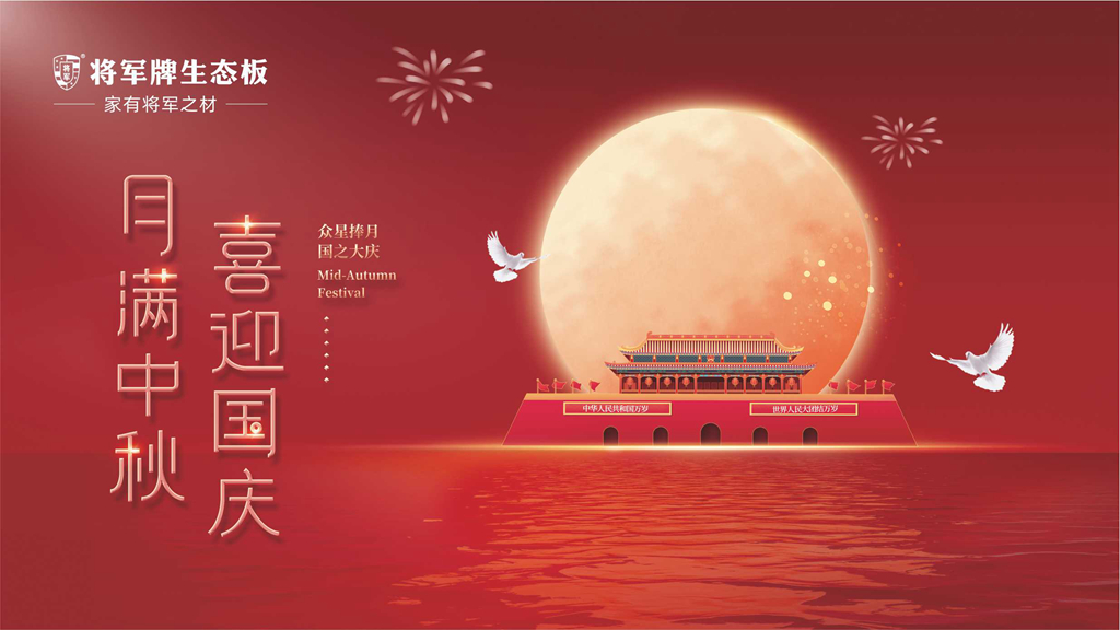 在新時代的曙光里我們迎來了偉大祖國74周年華誕韶華易逝而偉業(yè)不朽74載崢嶸歲月創(chuàng)造出令人驚嘆的“中國速度”和“中國奇跡”在這個舉國歡騰的時刻將軍牌生態(tài)板堅定綠色發(fā)展之路,為祖國74華誕獻禮!今年中秋遇上國慶,雙.