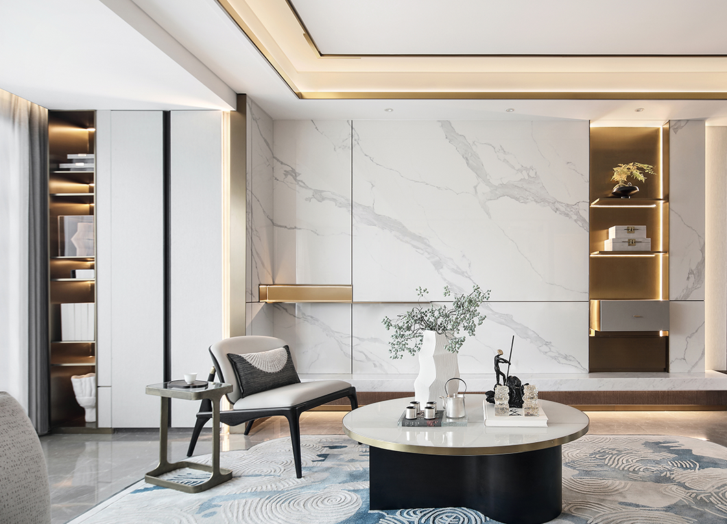 和風簾動,平俗與優(yōu)雅,喜相逢。水墨暈染的舒緩沁透,大理石飾面的清硬冷萃,于矛盾中疊搭,和合靜美。一毯情懷鋪古今。近觀,似“清風亂水波,蓮動影婆娑”;遠望,如“祥云浮紫閣,瑞氣繞朱軒”。生活的軌跡,炮制,打破,融新,輪回鋪陳。細節(jié).