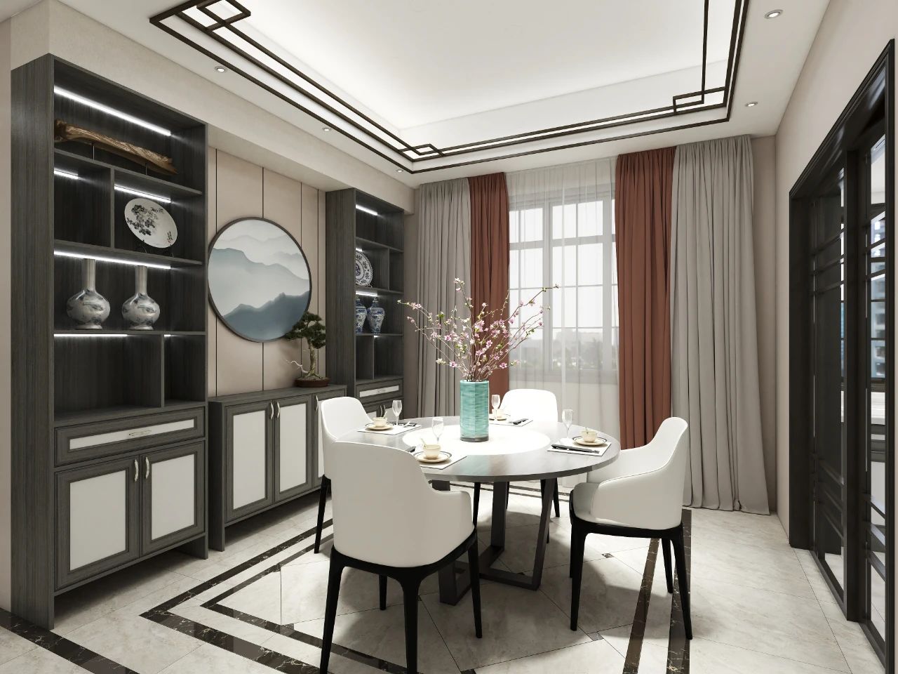 簡約式原木黑布紋電視柜、茶幾與新中式沙發(fā)座椅相得益彰,電視柜左右兩側(cè)各擺一裝飾花瓶,局部的小對稱充滿了“小心機(jī)”,讓空間更顯方正大氣。花瓶中一抹紅色的點(diǎn)綴,瞬間便讓空間頓時鮮活起來。