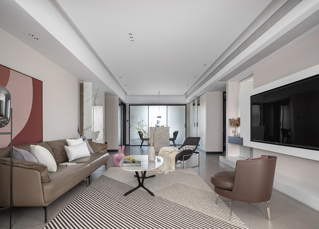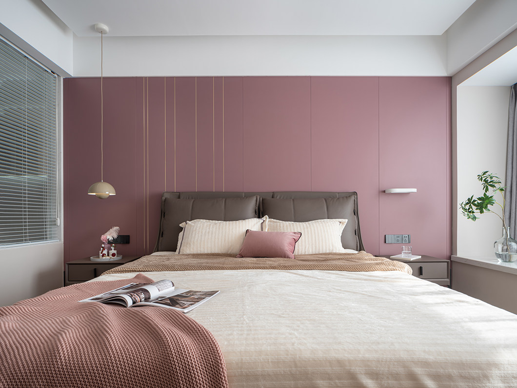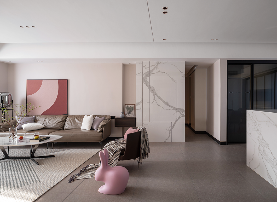 一幅粉色系壁畫猶如點睛之筆,更添一抹藝術氣息。極簡線型燈,高級且有質。