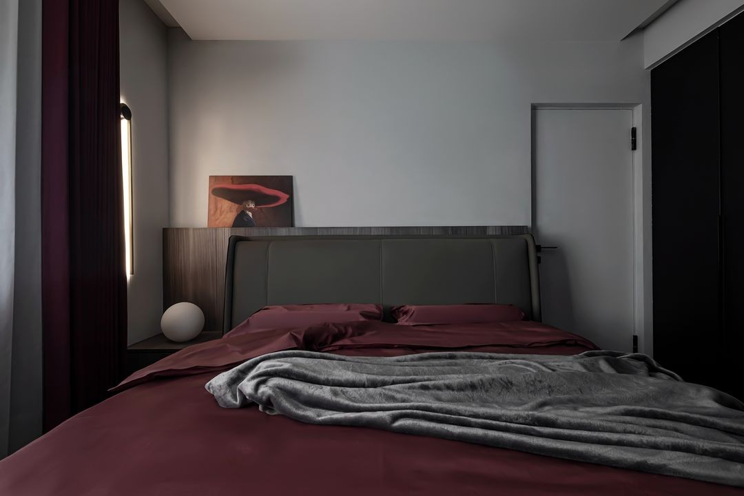 空間布局張弛有度,主臥室空間一如既往的深沉,整體黑白灰的空間里,同樣的那一抹紅,給人強(qiáng)烈的視覺(jué)沖擊增加了空間的暖意。